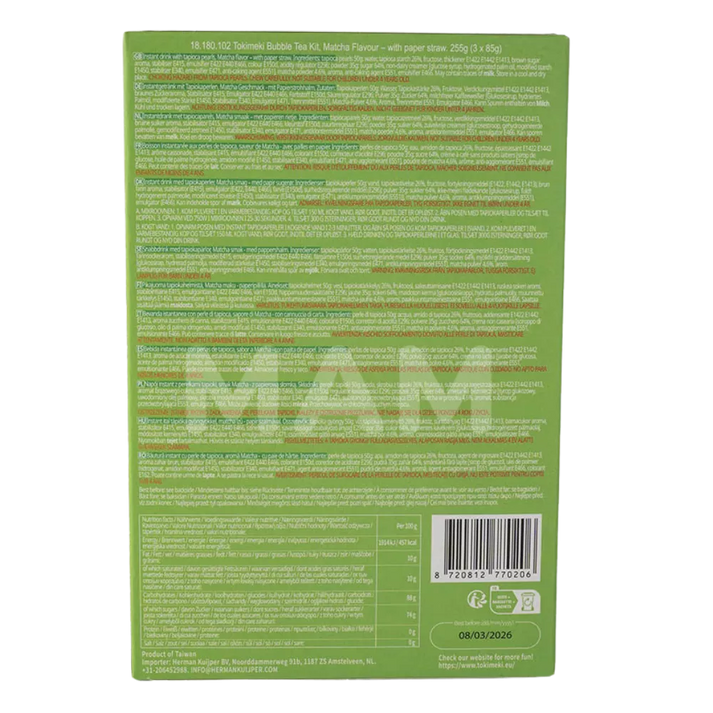 TOKIMEKI Bubble Tea Kit Matcha Flavour 255G bringt den authentischen Geschmack von japanischem Matcha direkt zu dir nach Hause. Dieses Kit enthält alles, was du brauchst, um einen cremig-süßen Bubble Tea mit einer leicht herben Matcha-Note zuzubereiten. Perfekt für alle Matcha- und Bubble-Tea-Liebhaber!