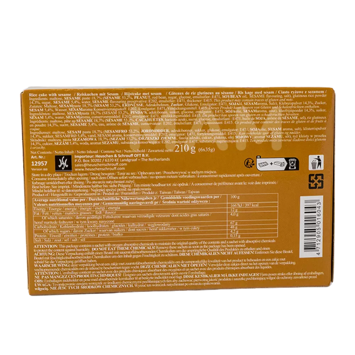 Maltose, Sesampaste 18,7% (Sesam 53,2%, Erdnüsse, Rote Bohnen, Zucker, Glukose, Emulgator: E471, Sojaöl, Salz, Sesamaroma), Klebreismehl 14,3%, Zucker, Sesam 5,4%, gereinigtes Wasser, Konservierungsmittel: E202, Emulgatoren: E471, Verdickungsmittel: E415. ⚠ Allergene: Erdnüsse, Sesam, Soja. Kann Spuren von Gluten und anderen Nüssen enthalten.